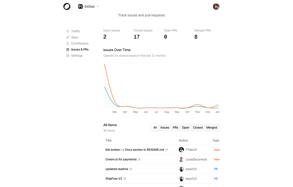 Track traffic, commits, stars and contributors to understand how your repo evolves in realtime.